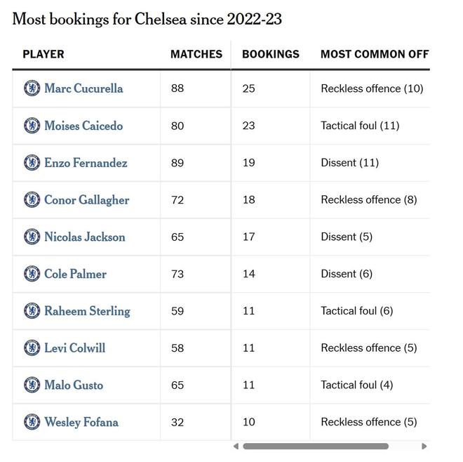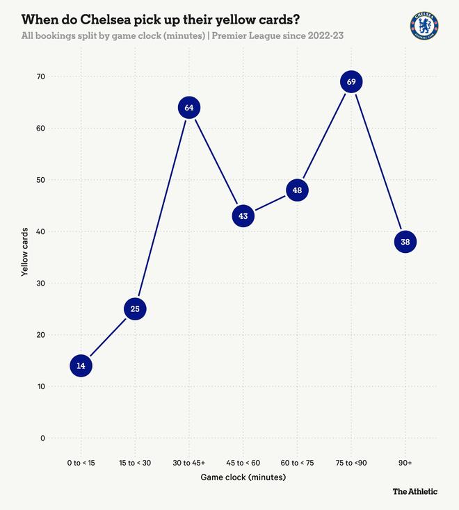 北京时间10月10日,据TA切尔西跟队记者Simon Johnson的报道,连续第三个赛季,切尔西都在大量的累积黄牌和红牌。从红黄牌这个指标来看,切尔西经常是难以战胜的球队。数字说明了一切。本赛季英超联赛公平竞赛积分榜上,每张黄牌得一分,一张红牌得五分。切尔西凭借15张黄牌和2张红牌,以25分的成绩领跑积分榜。切尔西球员在周六对阵利物浦的比赛中没有再得牌——这是他们本赛季第一次在联赛中避免黄牌——但或许恰如其分的是,主教练马雷斯卡本人也两次被出示黄牌并被罚下场。在对阵利物浦的比赛前,当被问及切尔西的战绩是否令人担忧时,马雷斯卡坚称他“没有发现任何纪律问题”。但如果你觉得你以前听过这位意大利人这么说,那你就对了。12个月前,当《The Athletic》首次提出这个话题时,他也给出了类似的回答。当时切尔西在联赛开局六场比赛中就领到了21张黄牌,在公平竞赛积分榜上垫底,他当时说道:“我认为这根本不是纪律问题。”但有太多相反的证据,让我们无法继续忽视它,而且这在伯利时代一直是一个问题,从他们2022年5月下旬收购该俱乐部开始。2022-23赛季,切尔西在公平竞赛积分榜上排名第六(86分)。接下来的一个赛季,他们的积分榜上排名第一(117分),其中包括创下105张黄牌的英超新纪录。在马雷斯卡执教的第一个赛季,切尔西的积分排名第二(106分)。如下图所示,切尔西在过去三年中累计的黄牌数(301)轻松超越其他任何一支球队。切尔西在此期间的红牌数也排名第二(12张,其中两黄变一红,六张直接红牌),仅比狼队少一张。以下是每张黄牌的具体内容。更直观地讲,自2022-23赛季以来,切尔西在英超联赛中因异议/争吵和假摔而获得的黄牌数量最高。他们在拖延时间(仅次于阿斯顿维拉,39张)和鲁莽犯规(仅次于水晶宫,95张)方面也排名第二。下面的图表显示了他们在英超联赛中各时间段的受罚情况,但这只揭示了部分情况。他们在75-90分钟的黄牌数排名最高,60-75分钟的黄牌数排名第二,下半场补时阶段的黄牌数排名第三。无论是疲劳,还是为了追分或保住领先优势而冒险,这显然表明他们在最后时刻处理球是最不擅长的。进一步分析,在第75分钟(包括暂停)之后,他们共收到107张黄牌,其中55张是因战术犯规(29张)和鲁莽犯规(26张),而24张是因异议/争论。鉴于图赫尔、波特和兰帕德都在2022-23赛季执教过切尔西,因此很难评估该赛季的任何趋势,但你可以从波切蒂诺(2023-24 年)和马雷斯卡(2024 年至今)的任期中寻找某种模式,他们是英超联赛中场均黄牌最多的切尔西主教练。在两人的带领下,切尔西因“战术犯规”受到的处罚最多。这种情况通常发生在你试图阻止反击、阻止球员进入或创造进球机会,或者非法阻止对手以确保比赛暂停,让队友重新回到防守阵型时。波切蒂诺的比赛风格相当开放,因此他在这方面的记录并不令人惊讶,但在马雷斯卡的带领下,他的比赛风格并没有太大改善,马雷斯卡希望他的球队通过控制球权来更好地控制比赛,这一点令人担忧。切尔西拥有英超联赛中最年轻的阵容,所以这必须被考虑在内。以下是过去三年切尔西在英超联赛中表现最差的球员名单。斯特林是年龄最大的球员,30岁,但他自2024年5月以来就没有再为俱乐部效力。其余球员的年龄在22岁至27岁之间。加拉格尔(现效力于马德里竞技)和雅克松(租借加盟拜仁慕尼黑)也已不再为俱乐部效力。不可避免地,这些球员大多是防守型球员,但帕尔默、恩佐-费尔南德斯和雅克松在所有类别中因异议而吃到最多黄牌的事实,凸显了球队的一些不成熟。费尔南德斯在比赛日要么是队长,要么是副队长。他19张黄牌中有11张是因异议而吃到的,这很难说是一个好的榜样。回顾马雷斯卡执教切尔西期间在英超联赛中的每一张牌(115张黄牌和4张红牌),许多人都觉得自己是咎由自取。切尔西在把握抢断时机方面并不是特别糟糕。事实上,自2022-23赛季以来,他们的抢断成功率为41.5%,在联盟中排名第四。问题在于,他们正将自己置于需要更多冒险挑战的境地。在同一时期,切尔西在英超联赛中犯下导致射门的失误次数比其他任何球队都多。其他方面纪律性差,例如传球失误和大力触球,也影响了他们的纪律记录。下面的例子来自切尔西在2024年9月4-2战胜布莱顿的比赛。在试图摆脱布莱顿的逼抢时,古斯托传球失误,球传给了桑乔,导致客队夺得球权并形成人数优势;库库雷利亚冲过来帮忙,却飞身扑倒了对手,吃到了一张黄牌。这是他个人的鲁莽行为,但却是由于他的队友们自己陷入了困境。桑托斯的大力射门让三笘薫有机会传球给迭戈-戈麦斯,查洛巴别无选择,只能在戈麦斯射门之前尝试拦截。不出所料,他未能成功,被罚下场。这些失误不仅在每场比赛中代价高昂,而且其停赛后果也是关键,特别是对于切尔西队中已经有数名防守球员受伤的情况而言。查洛巴因直接红牌停赛一场,马雷斯卡则在对阵利物浦的比赛中派出其他中卫首发。韦斯利·福法纳和库库雷拉在上赛季前七场比赛中累计领到五张黄牌,无缘客场1-2负于利物浦的比赛。本赛季,詹姆斯、哈托、乔治和库库雷利亚在前七场比赛中已经累计领到两张黄牌。这也带来了经济损失。如果俱乐部在一场联赛中被出示六张或以上黄牌,足协将自动处以2.5万英镑的罚款。如果再次犯规,罚款金额将翻倍,以此类推。上赛季,切尔西成为英