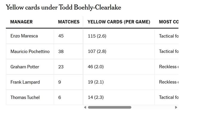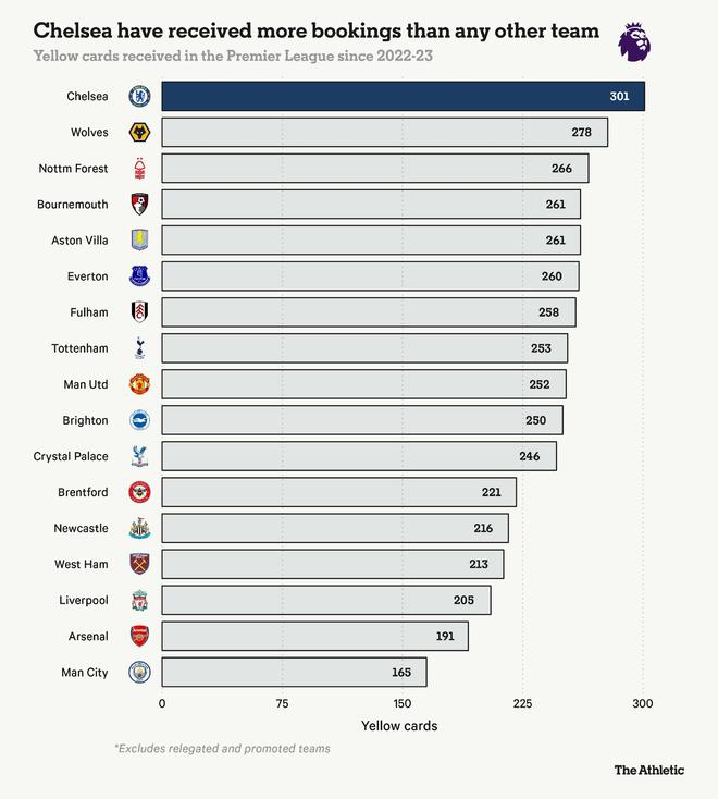 TA:切尔西自202223赛季以来吃到301张黄牌远超其他球队