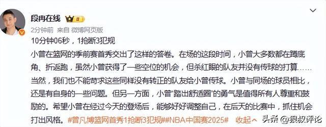 北京时间10月10日,NBA中国赛,篮网加时127-132不敌太阳。中国球员曾凡博代表篮网出战10分06秒,未能获得出手机会,没有得分进账,贡献1抢断。 赛后,曾凡博10分钟未能获得出手机会引发外界的热议。知名媒体人杨毅表示:不光是小曾这边,从整个比赛来看是残酷的,篮网这边是什么样的层次和水平,但是威尔逊上赛季打得这么好,蒂米等都没有保障合同,大家都没有端稳这个饭碗。 全世界最为顶尖的运动员都想要迈上这个舞台,把NBA残酷性体现出来。全NBA只有450个名额,只有全世界最优秀的顶级运动员才能踏上这个舞台,一场比赛能打10分钟左右,我们确实要承认小曾攻守两端有差距。小曾上场就可以看到非常急切,上去就2犯规,比赛能站上舞台,已经是成长,三年前他还是一个高中生,没有拿到任何合同,没有任何一场正规比赛。这三年不光是北京首钢的绝对主力,包括在国家队也扮演非常重要的角色,三年后,他站在这个舞台打这种比赛,已经体现出成长。 从全场比赛走势而言,曾凡博在场的这段时间大多数都在蹲底角、折返跑,虽然小曾获得了一些空位的机会,但杀红眼的队友并没有传球的打算。当然,我们也不能苛求这些同样没有转正的队友给小曾传球。小曾与同场的球员相比,还是有自身的一些问题。但另一方面,小曾“踏出舒适圈”的勇气是值得所有人尊重和鼓励的。希望小曾在经过今天的登场后,能够好好调整自己,在后天的比赛中,抓住机会打出风格。