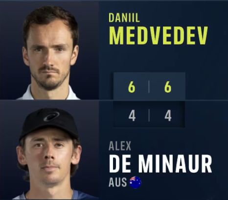 首盘第一局,“梅总”就完成破发,随后双方各自保发,局分来到5-4,在梅德维德夫关键的发球胜盘局上,他的发球出现波动,多次出现双误,好在德米纳尔在接发球上也没有太多办法,梅德维德夫以6-4赢下首盘。