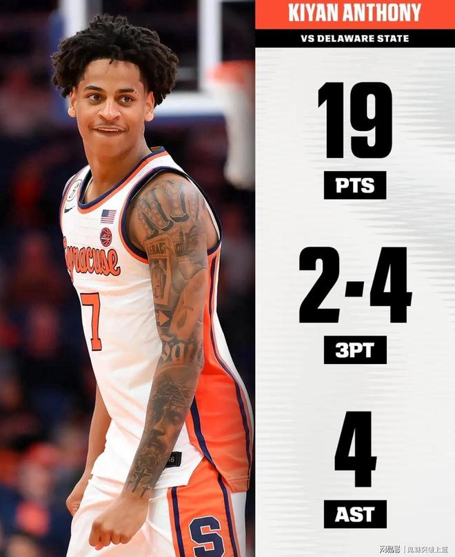 在此前结束的一场雪城大学VS德拉瓦州立大学的NCAA常规赛里,小甜瓜基扬安东尼迎来了他大学生涯的首次首发。此役,基扬安东尼全场出战29分钟,11投8中,三分4中2,4罚1中,贡献19分3篮板4助攻1抢断,且全场没有出现任何一次失误。毫无疑问,基扬安东尼的首次首发堪称完美!在小甜瓜的神勇发挥下,雪城大学最终以83-43狂胜德拉瓦州立大学豪取得开季两连胜。