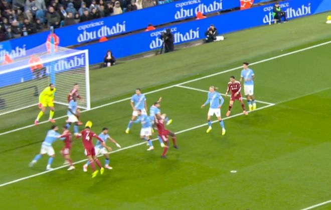 比赛的第8分钟,利物浦后卫失误,多库禁区内断球突破被马马达什维利绊倒,主裁判回看慢镜头之后判罚点球,哈兰德主罚点球,被马马达什维利飞身封出。