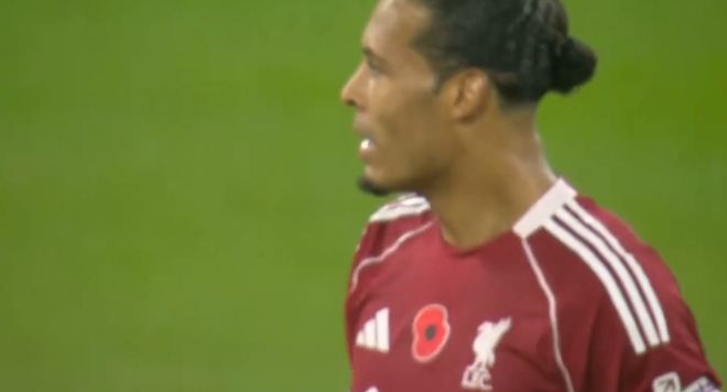上半场补时第2分钟,尼科禁区前远射,范戴克下意识伸脚一挡,球变线之后飞入球网。丢球之后,范戴克在大雨中喃喃自语,显然为自己的糟糕运气而感到郁闷。