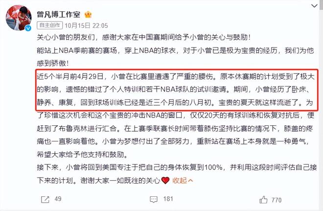 他个人的工作室也随之发出声明,表示小曾在4月末的比赛中受到了严重的腰伤,在这几个月期间休养了将近3个月的时间,因此错过了很多训练。