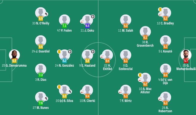 【出场阵容】曼城首发:25-多纳鲁马、3-鲁本·迪亚斯、24-格瓦迪奥尔、33-奥赖利、27-努内斯、4-尼科·冈萨雷斯、20-B席、10-谢尔基(53'26-萨维尼奥)、11-多库(74'7-马尔穆什)、47-福登、9-哈兰德替补未出场:1-特拉福德、5-斯通斯、6-阿克、21-努里、82-刘易斯、4-赖因德斯、52-鲍勃利物浦首发:25-马马尔达什维利、12-布拉德利(83'2-戈麦斯)、4-范戴克、5-科纳特、26-罗伯逊(56'6-凯尔凯兹)、38-赫拉芬贝赫、8-索博斯洛伊、10-麦卡利斯特(74'17-琼斯)、11-萨拉赫(83'14-基耶萨)、7-维尔茨、22-埃基蒂克(56'18-加克波)替补未出场:28-伍德曼、3-远藤航、9-伊萨克、73-恩古莫哈相关资讯