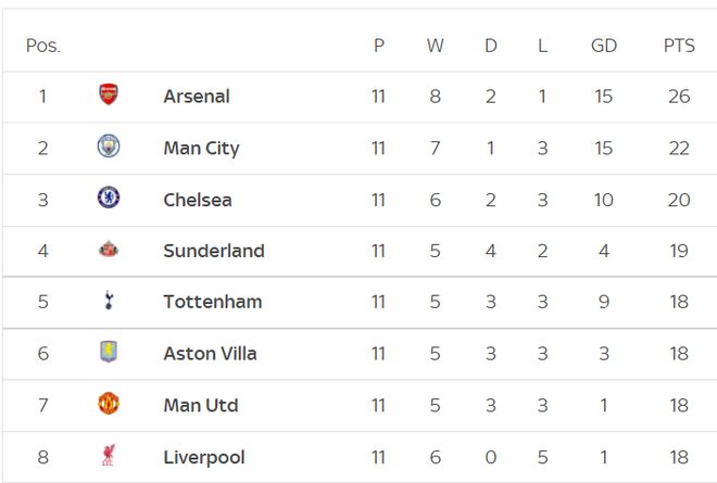11轮之后,曼城以22分排名第二位,阿森纳以26分排名榜首,而卫冕冠军利物浦以18分排名第8位,甚至比曼联还低了一位。