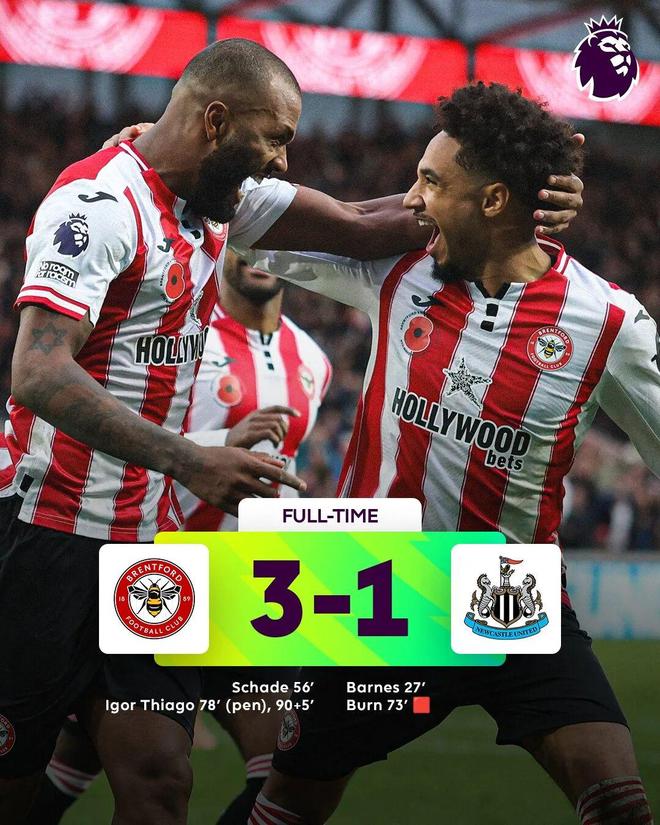 随后,沙德头球破门扳平比分,丹-伯恩送点后染红离场。伊戈尔-蒂亚戈梅开二度帮助布伦特福德锁定胜局。最终,布伦特福德3-1逆转战胜纽卡。本轮过后,目前枪手依然领跑英超积分榜,曼城落后4分位居第二位,切尔西20分排在第3名,桑德兰19分排在第4位,从第5名到第9名的球队,全部积18分,竞争异常激烈。